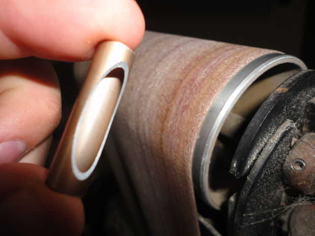 Ahora que el tubo se corta es hora de hacer el windows para que pueda ver su resplandor de la pelotilla. Lo hice sosteniendo el tubo contra el tambor superior de mi lijadora de banda que crea una ventana de oval limpiarla muy bonito. Si plan sobre el uso de este método recuerda que un recipiente con agua cerca para que usted puede apagar la tubería cuando calienta por la fricción de la lija. Si usted no tiene una lijadora de banda en casa puede hacer sus windows por el tubo de fijación en un torno y con diferentes tipos de archivos para crear formas de ventana diferente.