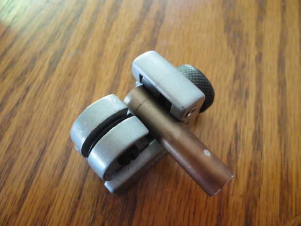 Utilizando el cortador de tubos corté el tubo de flecha de aluminio a mi deseados longitudes, generalmente haciendo el tubo cerca de ¼" de más de la pelotilla de resplandor que planeó sobre el uso; es decir 1" resplandor pellets = 1 ¼" tubo de aluminio, (esto permite espacio para perforar los agujeros para colocar anillos de resorte más adelante). Para utilizar el inicio de cortador de tubo girando el tornillo de ajuste hasta que el tubo pueda deslizar entre las ruedas de un lado y el disco de corte en el otro. Apriete el tornillo de ajuste hasta el disco de corte en contacto con la tubería. Hacer rotaciones alrededor de 2 de la tubería y luego apretar el tornillo un cuarto de giro y otro 2 rotaciones. Seguir haciendo esto hasta que haya cortado el tubo, esto dará como resultado un bonito corte incluso con poca limpieza. Nota: lo que no quieres hacer es arrancar abajo en el cortador de tubos como eres el hombre más fuerte del mundo y tratar de cortar el tubo en una rotación, que no es como la herramienta está diseñada para trabajar y todos vas a lograr es arruinar una pieza de tubería.