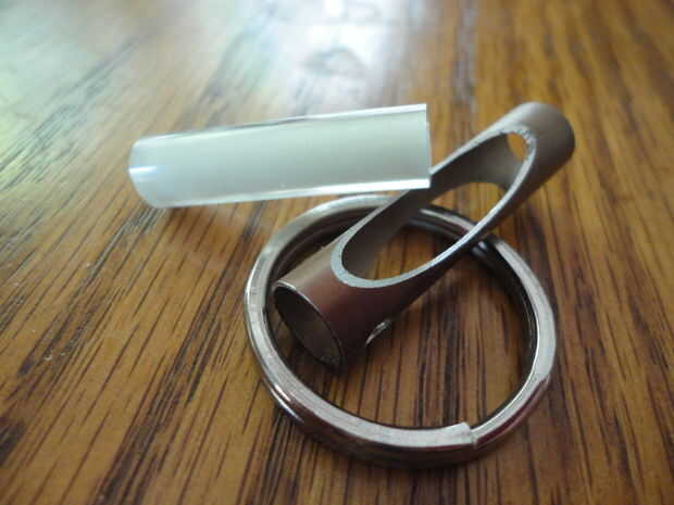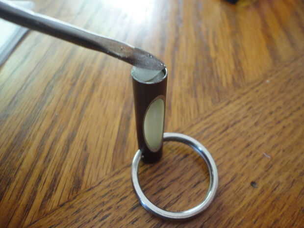 Comience abriendo el anillo de resorte y enhebrar por los dos agujeros en la parte superior del tubo del metal. Con el anillo de resorte en su lugar, inserte la pelotilla resplandor a través de la parte inferior del tubo. Nota: si usted está teniendo un momento difícil conseguir el sedimento en el tubo puede poner una pequeña gota de jabón en la parte exterior de la pastilla, esto ayudará a que deslice fácilmente en su lugar. Si el pellet es un poco demasiado largo dar un corte con la navaja Xacto. Por último para mantener todo en su lugar vamos a mezclar un pequeño lote de epoxy, no resplandor polvo esta vez. Mezclar el epoxi y frotis en cualquier espacio restante dentro de la parte inferior de la tubería del metal (es por esto maltratados por las paredes en el paso anterior, para que el epoxi tuvieran algo a. Finalmente establecer su resplandor terminado fob en extremo durante una hora permitir que el epoxi secar y listo.