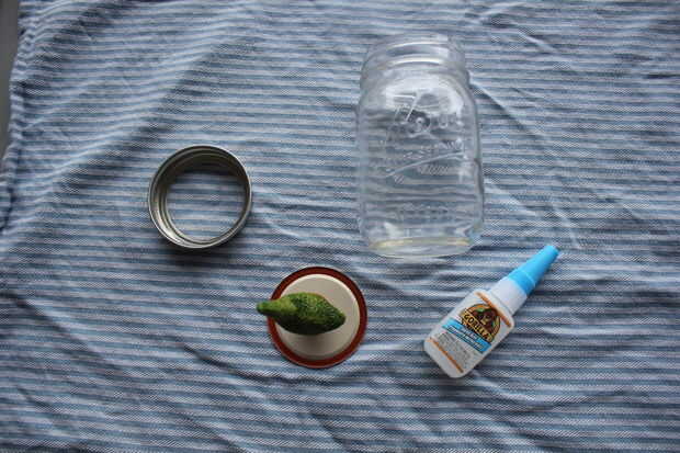 Asegúrese de que son capaces de cerrar el frasco una vez que están en su lugar. Cuando usted está contento con su configuración. . Utilice el pegamento para fijar en el interior de su tapa. Sugerencia: Obtener los mejores resultados si lo dejas totalmente seco. Esto podría tomar hasta una hora dependiendo de la base de tu figura.