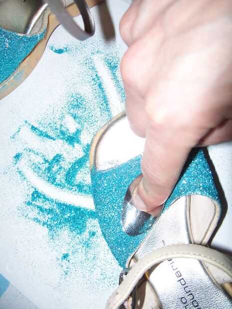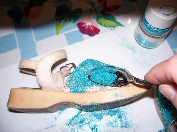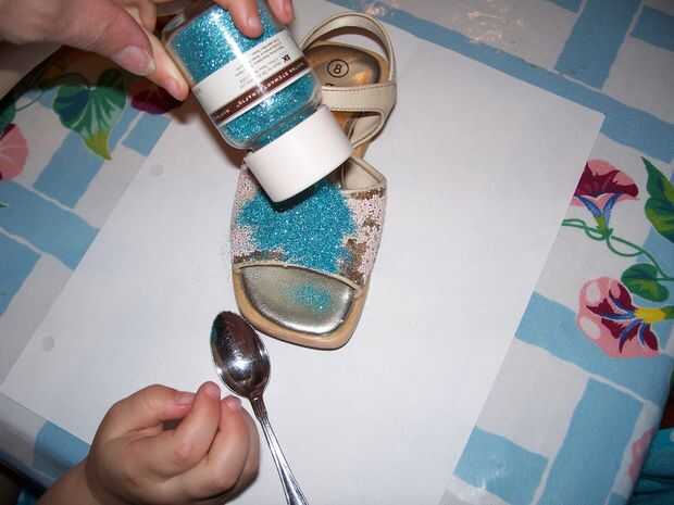 Zapato en papel arrugado y vierta brillo en el área de pegado. Utilice una cuchara para sacar brillo y devolver el zapato o mover zapato al segundo trozo de papel y luego vierta brillo desde la primera pieza de papel sobre él como necesario y presione con la parte posterior de la cuchara para meter en la cola, asegúrese de que hay un montón de brillo bajo la cuchara para que no arruinara el pegamento. Seguir haciendo eso hasta que tienes toda la zona encolada cubierta con una buena capa de brillo. Esta es la parte que los niños pueden ayudar con, al menos un poco, dependiendo de su edad.