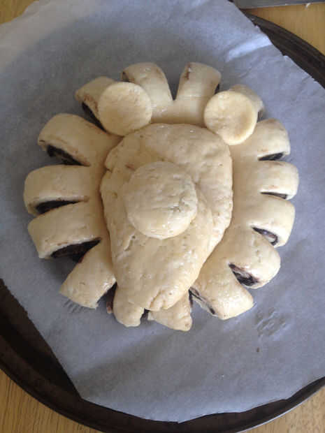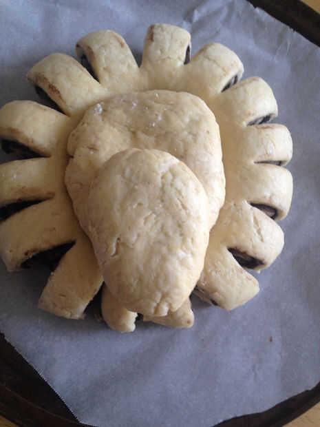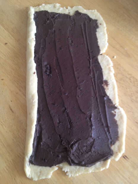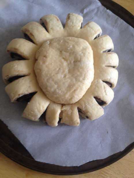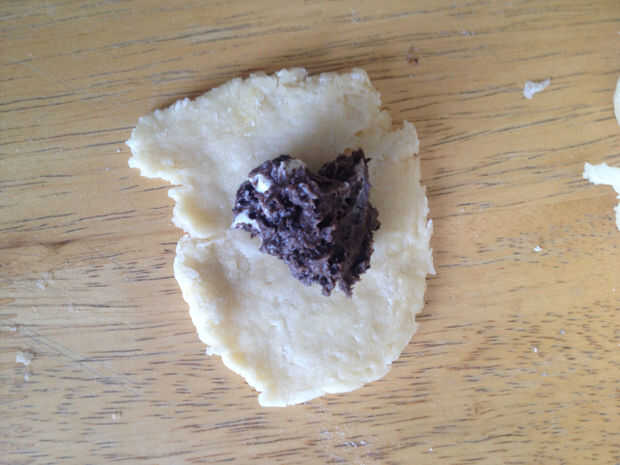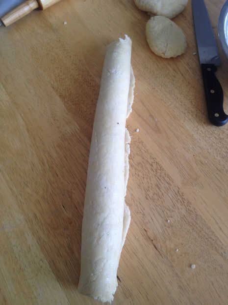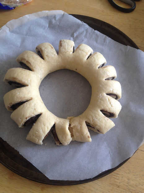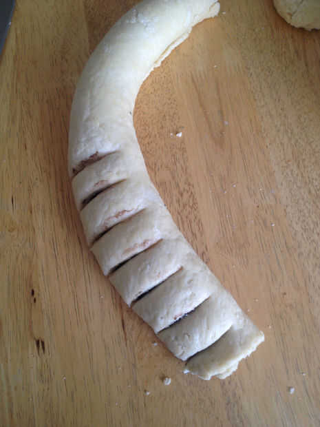 Cubrir los lados de dos extremos del tronco en rodajas y forma un anillo y coloque en la hoja de la hornada