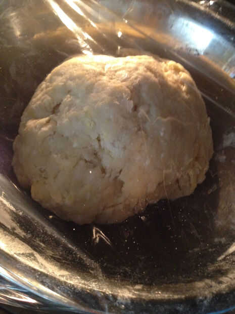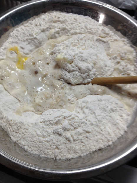 Mezcle la harina, la sal y azúcar. Hacer un pozo en el centro, añadir yema de huevo, mantequilla y verter en la mezcla de levadura. Mezclar con cuchara de madera o las manos. Amasar y dejar reposar cubierto en un lugar tibio durante 20 minutos.