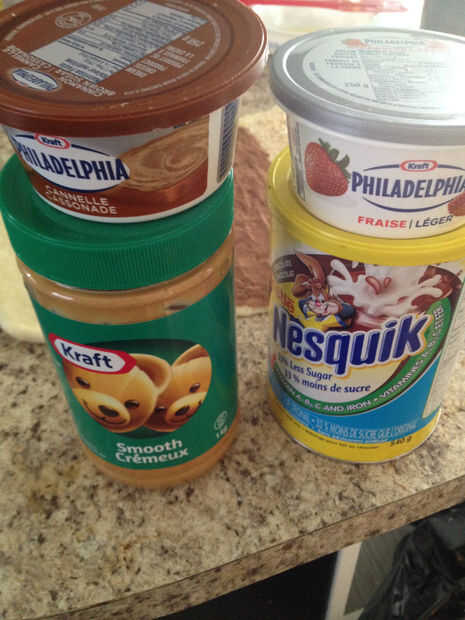 Queso crema de canela, fresa queso de crema, mantequilla de cacahuete cremosa y Nesquick! (por supuesto puede utilizar una mezcla de energía de cacao y azúcar).