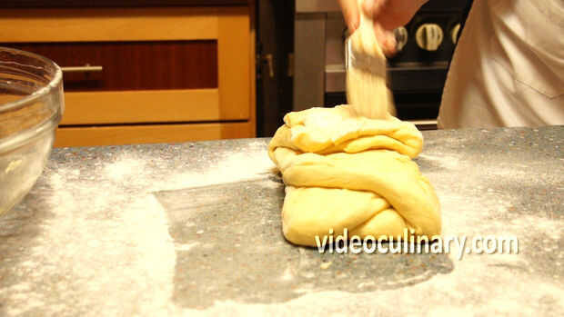 Extender la masa sobre la superficie de trabajo enharinada. Acariciar suavemente hacia abajo la masa desgasificarlo. Tomar un tercio de cada lado y doblar hacia el centro, cepillado a harina cruda.