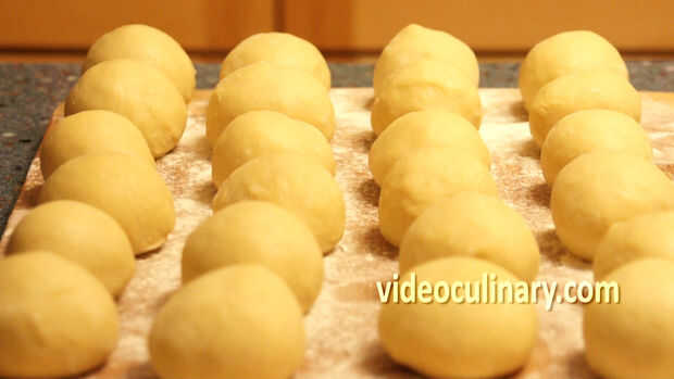 Para dar forma a la brioche tradicional del à de tête, dividir la masa en 24 partes iguales. Preshape cada pedazo en una ronda, coloque sobre una superficie enharinada y refrigere hasta que se enfríe, unos 20 minutos.