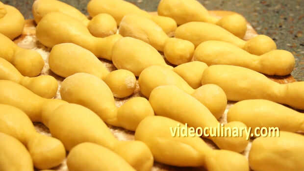 El sujetador de un cuarto de la bola con el lado de la mano girando hacia adelante y hacia atrás. La pieza más grande de la masa debe ser 7 cm y el más pequeño debe ser 2 cm.