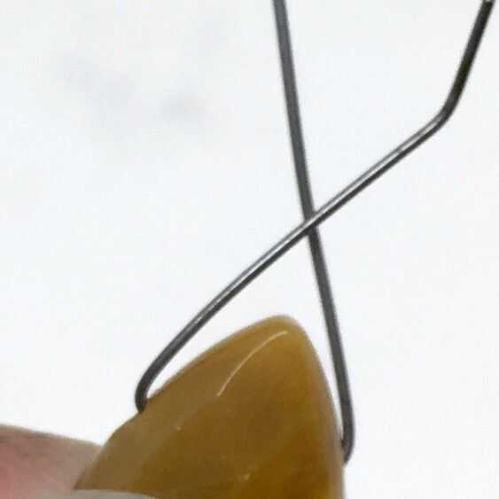 Tire del cable a través del agujero y doblarla para que un lado se está pegando hacia fuera, alrededor 1" más allá de la parte superior puntiaguda de la briolette. Doblar el otro lado del alambre, para que cruzan justo por encima del punto de la briolette. Quieres un poco de espacio entre el cable cruzado y la parte superior del grano, como se muestra en la foto.