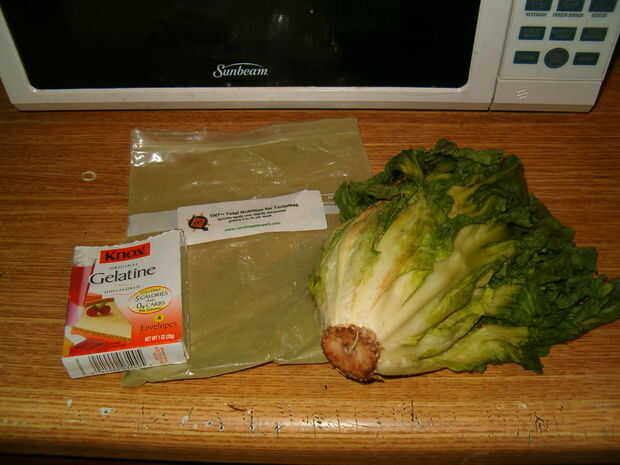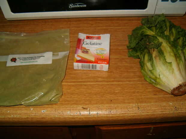 Este es el paso más versátil. Puede agregar cualquier cosa que sea segura para sus peces comer. Ya que es para mi Bristlenose Pleco, acabo de añadir lechuga (mi lechuga era una cabeza de escarola que tengo para mi tortuga, pero ella odia escarola, por lo que acabó siendo alimento de pescados. Era seguro wilty, pero todavía un poco. Probé algunos primeros y no han enfermado. ) y un suplemento (TnT Nutirtion Total de tortugas) que es básicamente justo diferentes flores y plantas de la tierra a un polvo. He añadido esto puesto que sólo tenía un tipo de lechuga y yo quería que fuera una comida más completa. El único ingrediente que es constante es la gelatina sin sabor. He utilizado a Knox.