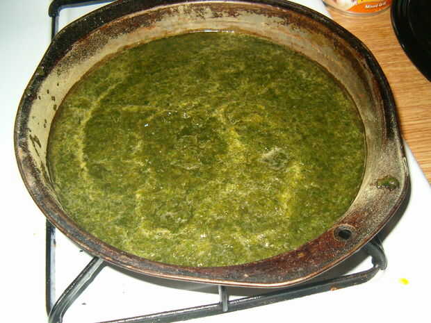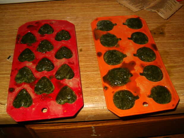 Ahora es el momento de moldear. Tengo estas cubiteras ingenioso del árbol del dólar ($1 cada uno), pero puede usar cualquier cosa (mayoría de la gente a utiliza sus bandejas de cubos de hielo). Una cabeza de lechuga probablemente llenará 4-6 de las bandejas pequeñas. Sólo tengo 2, por lo que vierte el resto en un molde para pasteles.