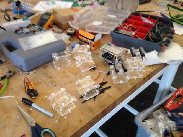 Esto puede ser tan complicado o tan simple como te gustaría que fuera. Los primeros bots que hice fueron solo calientes pegado a una hoja de acrílico y funcionó muy bien. Las versiones más últimas eran corte láser de acrílico de la cutfile adjunta. También tengo un chasis 3D imprimible que puedes utilizar si lo desea. El chasis puede dar sus enjambre de pequeños robots algunos caracteres, por lo tanto divertirse en este!