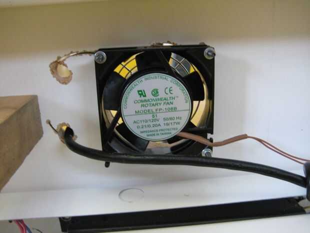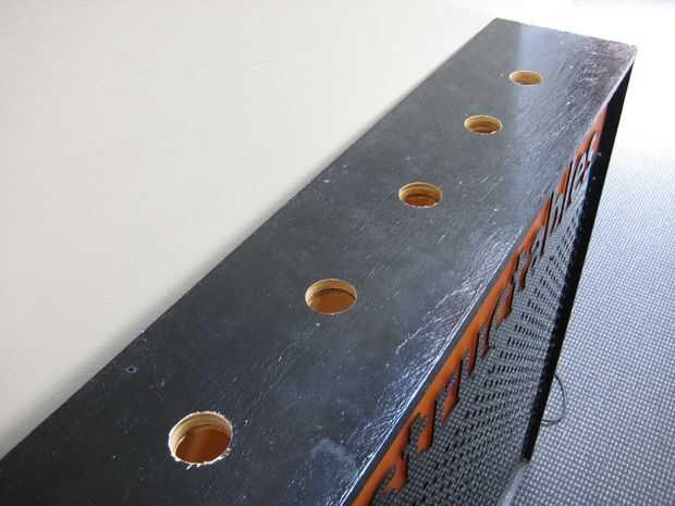 Para ayudar a disipar el calor, perforé cinco orificios de 1,5" en el panel superior de la caja. Dentro de la caja pienso montar dos 3.75 pulgadas giratorio "" ventiladores de McMaster que se ejecutan en el mismo enchufe de 110 voltios AC. Acumulación de calor fue un verdadero problema hasta que instalé los ventiladores. Una vez en, el caso funcionó como cool como un gatito.