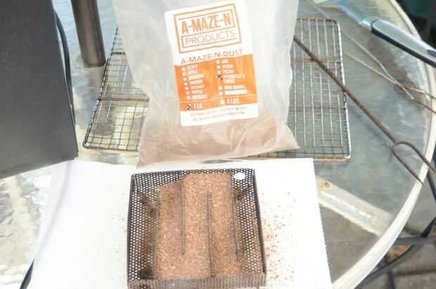 Esta mezcla de aserrín es nogal americano, arce, manzana y cereza que es muy agradable en la carne de cerdo. El ahumador eléctrico puede proporcionar humo también, pero a una temperatura más baja de fumar prefiero usar el fumar frío y simplemente usa el elemento eléctrico en mi Masterbuilt smoker para controlar los niveles de calor.