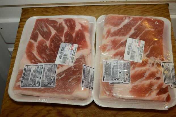 Tomé estos en el mercado asiático local. Menos 2,5 libras cada uno a $ 3,49/lb. Ellos fueron congelados cuando llegué, pero son realmente bonitas y la Plaza cortes de vientre. El mercado asiático tuvo los mejores precios que pude encontrar localmente, mi chico de carne orgánica local regular no venderme sus vientres, ya que él hace en bacon a sí mismo, pero venderme hígado de cerdo y grasa de cerdo para cocinar paté hacer. Estos vientres tienen la piel en ellos, que nosotros no estamos quitando para el proceso de curado y fumar. La piel se guardarán después de fumar para el uso en granos de sopa y aromatizantes en otros deliciosos platos.
