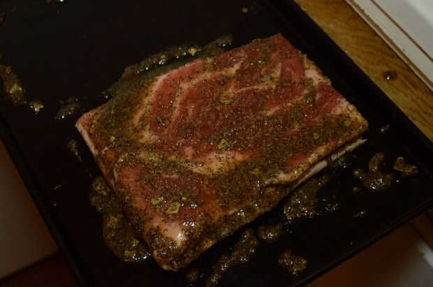 Frotó la cura ambos lados en una hoja de galleta. Sólo conseguir sus manos allí y frotarla en ambos lados y capa cada pulgada cuadrada del vientre con su pasta de curación y de la especia.