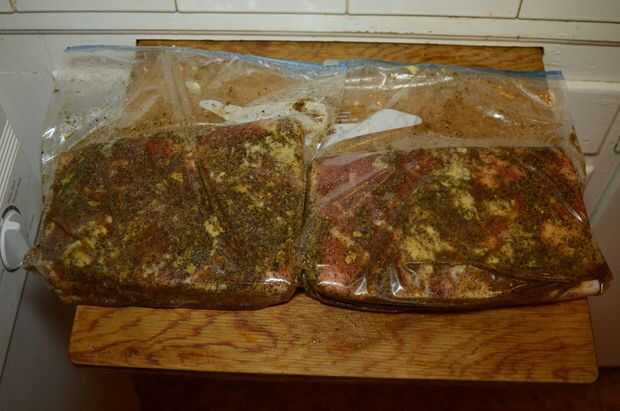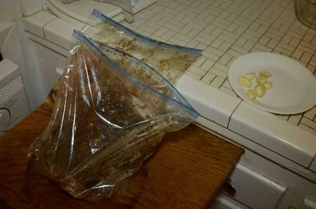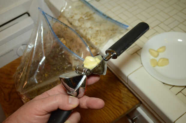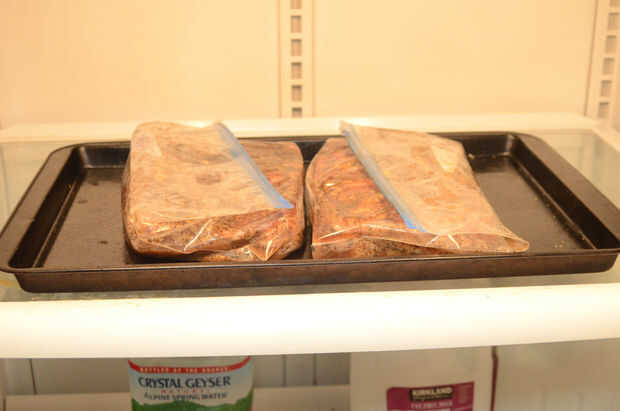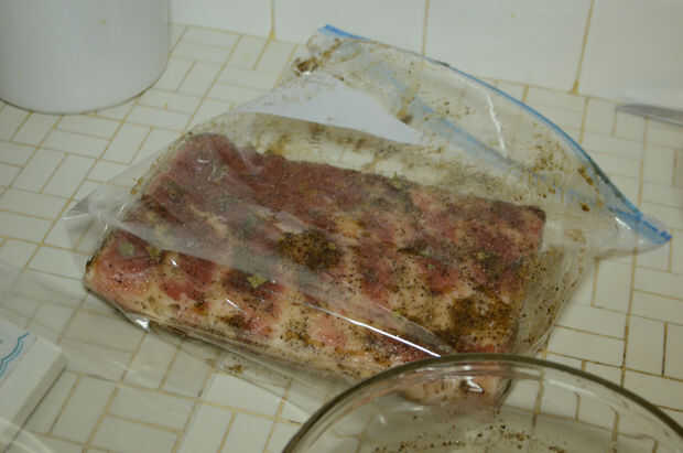 Poner cada vientre en una bolsa ziplock cualquier curación mojada sobrante del tazón de fuente. Tengo una prensa de ajo pero rara vez lo utilizo, fue utilizado para aplastar a los ajos y mezcle dentro de cada bolsa en igual cantidad (aproximadamente 3-4 dientes en cada bolso, piel y todo). Exprimir todo el aire de las bolsas como sea posible y sello. Limpie el exterior de la bolsa para eliminar los gérmenes y cura exceso. Poner las bolsas en una bandeja para hornear galletas en el frigorífico durante al menos 7 días para curar, lo bancos todos los días. Cuando le da la vuelta el bolso, frotar la cura en la carne por masajear la parte exterior de la bolsa de trabajo realmente la curación en el vientre.