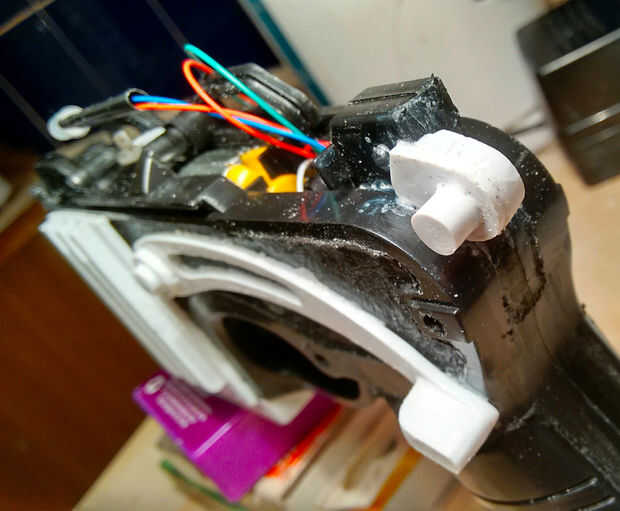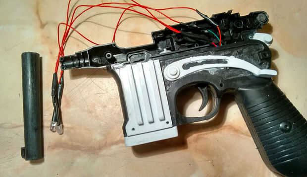 También necesita ampliar el cableado para los LEDs, se cinta los dos juntos y van a vivir dentro del barril del arma.