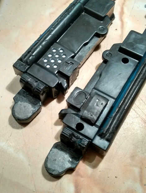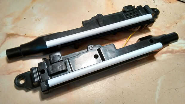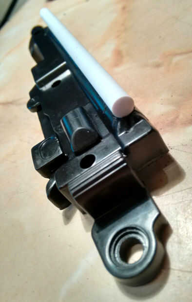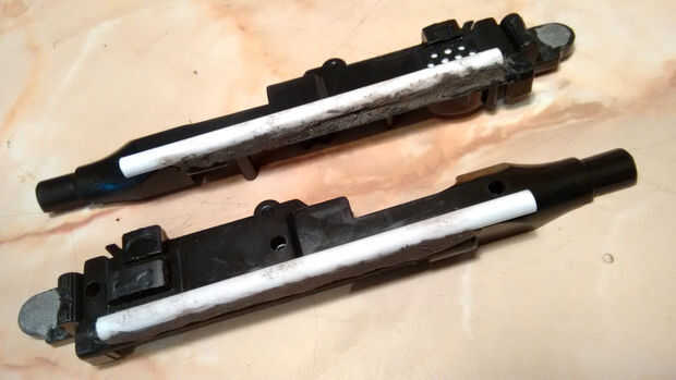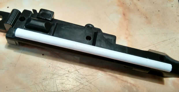 Porque el arma en el juego tiene un distintivo corredera, utilizamos la barra de plástico redondeada recrear. Con la Dremmel herramienta, ampliar el surco que corre a lo largo de la corredera para que las barras van a quedar al ras en ellos.