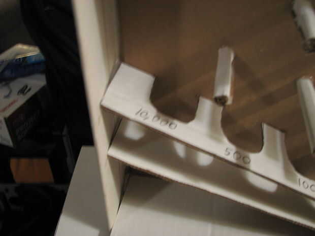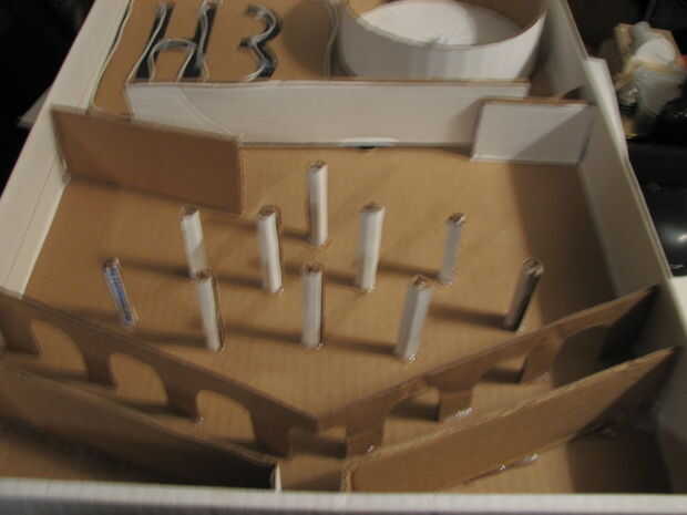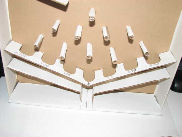 Desde aquí he añadido una rampa para los chicles dirigir a algunos topes. Los topes son, son laminados en pedazos de cartón y caliente pegados a la placa de soporte. Estos actúan como sonido se registra para el sensor de los sonidos y se ilumina EL alambre. También pensé que una junta que tiene agujeros para valores de punto diferente, los chicles caer a través de aseado y gente podía podía ver quién obtiene más puntos.