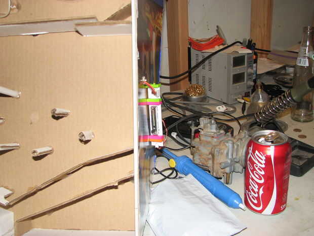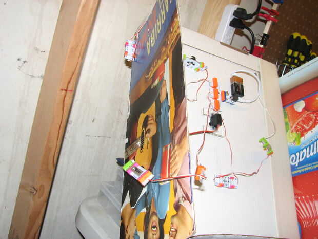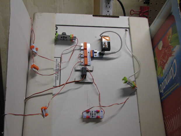 Alambré el botón motor al motor entonces al poder. Que también tenía el servo atado a la botella. Entonces el sensor de sonido para EL alambre y todo esto para el bloque de alimentación con los cables del conector. Aquí he actualizado nuestras fotos para mostrar el cableado en la parte de atrás y mostrar algunos de los chicles en el juego. Todo esto fue una explosión para la construcción y de la diversión para jugar con.