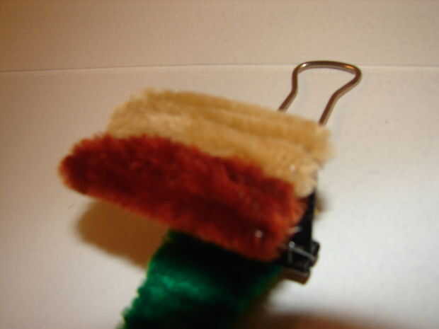 ahora un limpiador de pipa y doblar un pedazo de él es en el interior de la parte negra del clip y pégalo allí. luego Envuelva el limpiador de pipa a través del clip y luego pégala cuando se hace. hacer esto al frente y entonces poner pegamento en el interior a fin de.