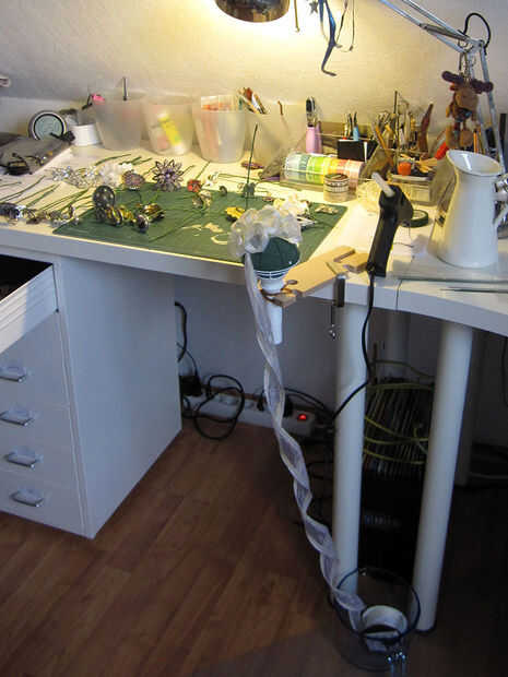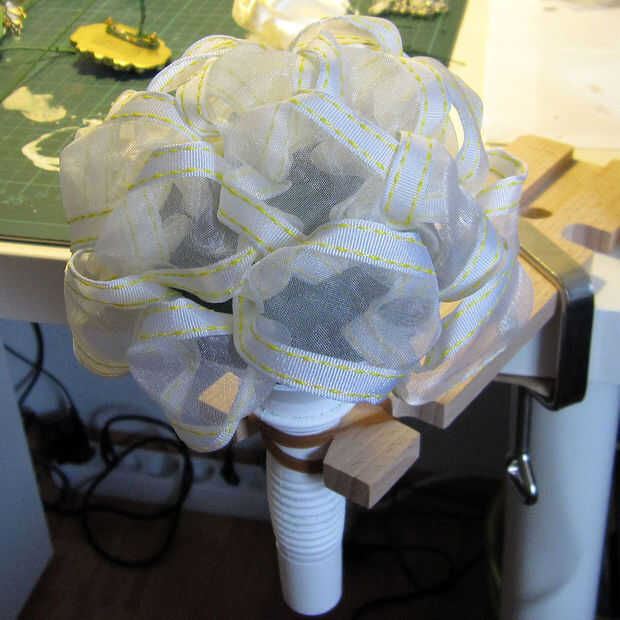 Para conseguir una bonita forma redonda del bouquet y mirada lleno utilizar algunos del alambre para fijar una cinta ancha en bucles sueltos todo el titular del ramo. Puse la cinta en un recipiente para evitar que la cinta rodando por el suelo.