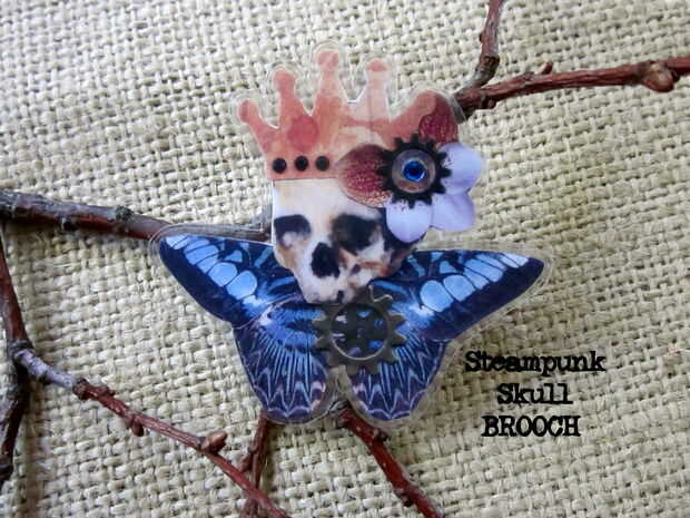 Este broche de calavera de steampunk es aproximadamente 2.25 por 2.25 pulgadas. Las características del diseño una corona naranja con una flor, alas de mariposa azul y algunos engranajes a punk hacia fuera. La flor está adornada con un strass azul.