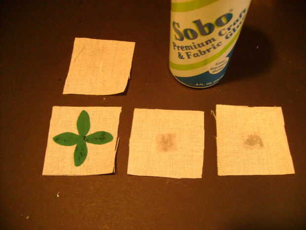 1. pegamento de la tela pegar los cuadritos de tela conductora en medio de remolque de las plazas más grandes tal y como aparece en las fotos. 2. Tome la tercera plaza y corte un orificio en el centro (será utilizado para el LED), alrededor de este pegamento agujero las hojas en forma de flor o cualquier otra forma que se desea.