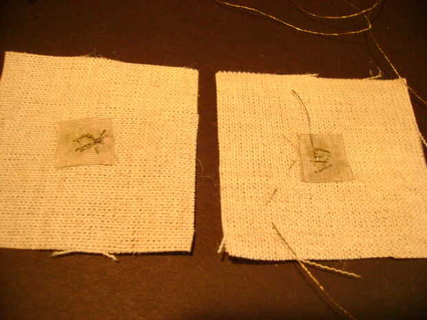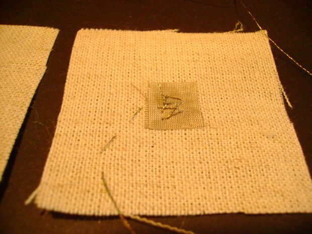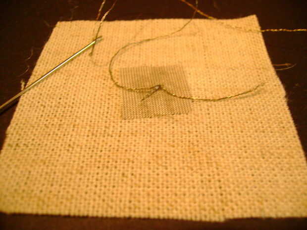 2. Enhebre la aguja con el hilo conductor. Elige uno de estos cuadrados y hacer varias puntadas en el pedazo de tela conductora, no corte el hilo.