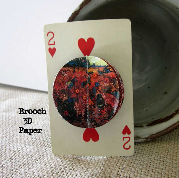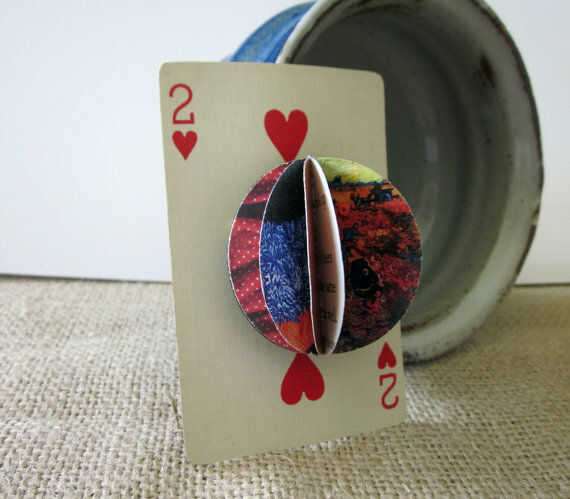 El broche es un círculo de 1 5/8". Cuatro diversos diseños han sido cosidos y doblado para crear una media esfera dimensional. Instrucciones con fotos paso a paso para hacer tu propio broche se pueden encontrar en mi blog. Te divertirás pasando a través de su correo basura y el viejo circulares. Contienen todo tipo de imágenes que puede utilizar para hacer un broche de su propio diseño.