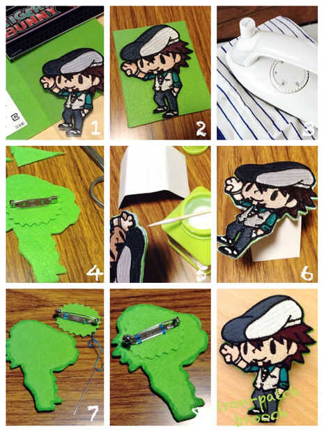 7 ~ 8. Fije el perno. Coser el pasador para el montaje y fijar por el pegamento en la parte posterior. O simplemente coloque el pasador en la parte posterior por el pegamento.