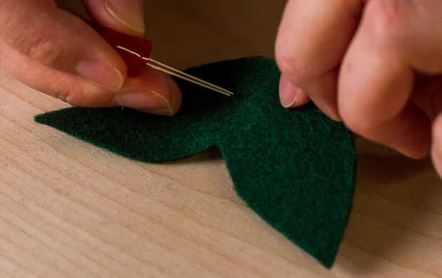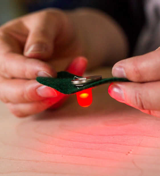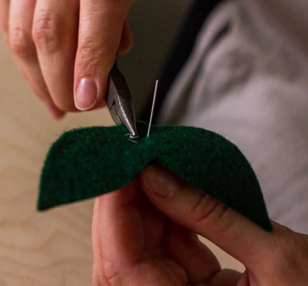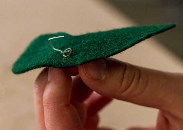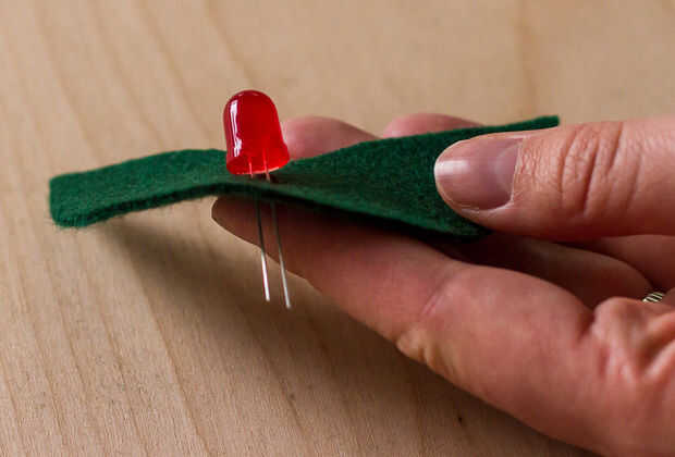 Meter los extremos metálicos (conductores) del LED a través de las hojas de fieltro.