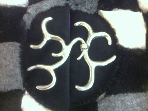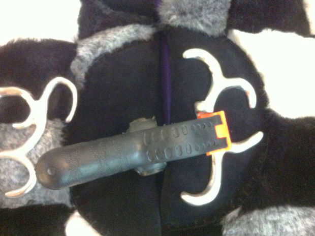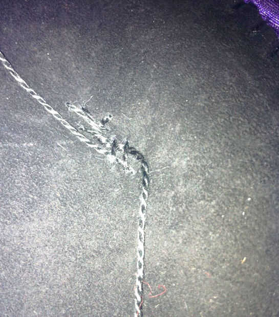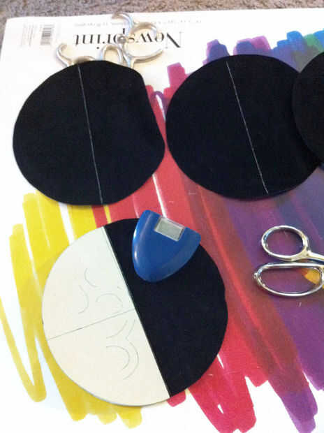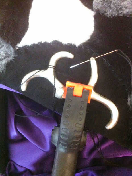 Una vez que los círculos estaban en el lugar, cosió las patillas de abajo. Abrochó dos juntos, colocados en la capa centrada en su círculo y sujeta a un lado mientras que cosido. Hizo tres puntadas grandes, no demasiado cerca, sobre varias de las ramas de los broches y había escondido los extremos por debajo en el interior de la capa, luego les nudos. Para sujetar el nudo (algodón a veces obras sueltas), poner una gota de Fray check en cada nudo y corte las puntas a una pulgada.