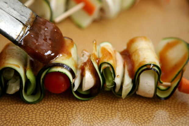 Utilice un cepillo de cocina para distribuir el adobo de los pinchos.