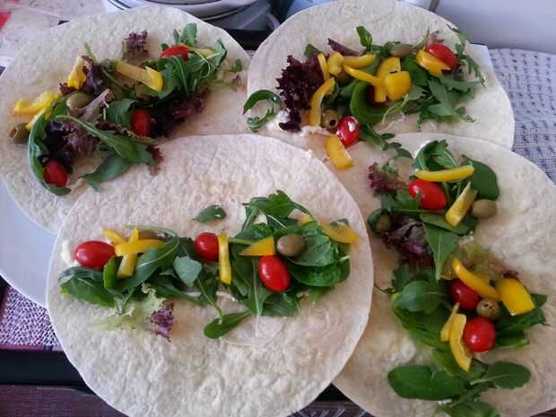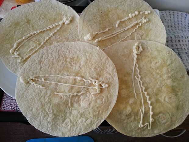 Simple tortilla blanca, algunos mayo. Si usted quiere a gusto como un kebab shop, tres veces como mucho mayo.