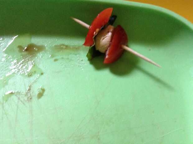 Pongan los ingredientes en el palillo en la rebanada de tomate orden, rodaja de mozzarella, pedazo de albahaca, rodaja de tomate. Luego lo mates en la preparación.