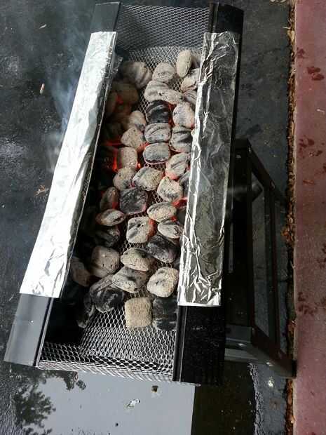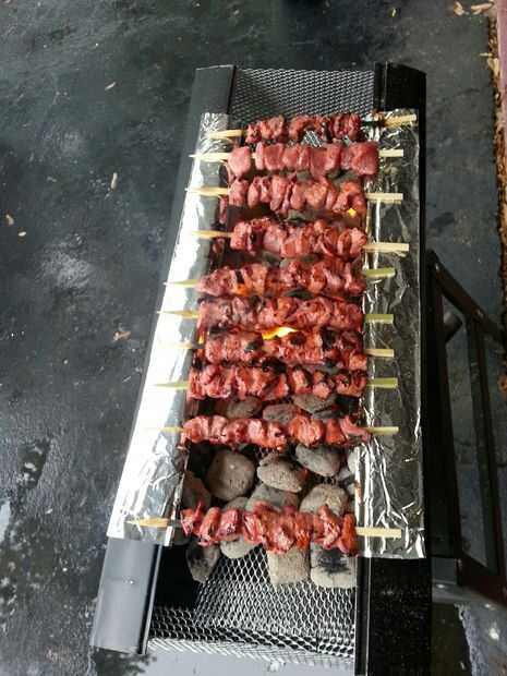 He hecho esta parrilla con brochetas en mente. Puse papel en el borde de la parrilla para ayudar con la limpieza. Extendió las brasas uniformemente en una capa. Poner las brochetas en la parrilla. El fuego estaba caliente así que usa guantes cuando yo estaba cuidando el fuego.