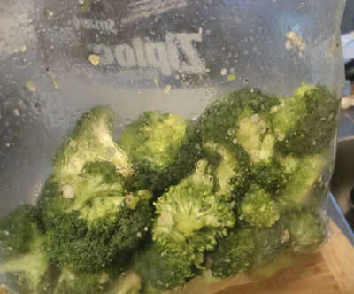 Encontré que una manera más fácil es poner el brócoli en una bolsa ziplock, salsear la mezcla de aceite de oliva y luego selle la bolsa dejando aire dentro. Agitar vigorosamente durante 2-3 minutos cubrir uniformemente el brócoli.