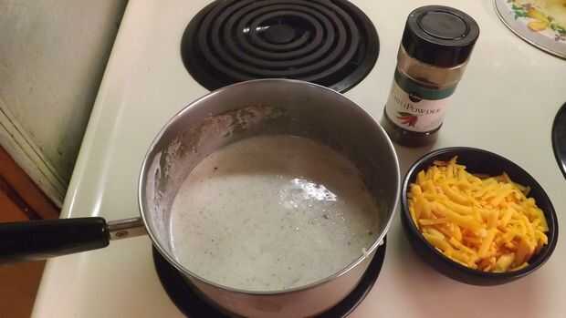 2. Cuando esté caliente, agregue el ajo, S & P y Chile en polvo. Agregar el queso Cheddar y revolver constantemente hasta que el queso está derretido y bien mezclado. Gusto y ajuste de condimentos si es necesario (no se quemen la lengua).