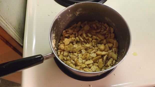 2. Tan pronto como la mantequilla se haya derretido, se desmenuzan las galletas en la bandeja y revuelva para cubrir.