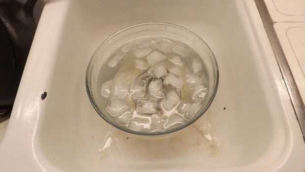- Llene un recipiente grande con agua y cubitos de hielo.