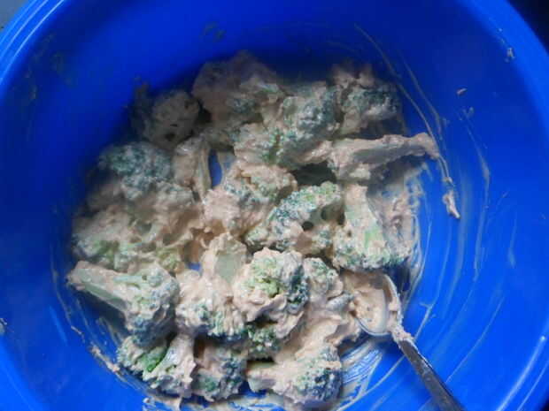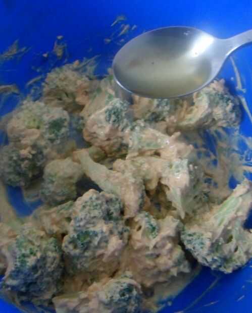 -Añadir las florecillas y una cucharadita de aceite y mezclar todo para que las florecillas se mezclan muy bien con yogur y especias de todos.