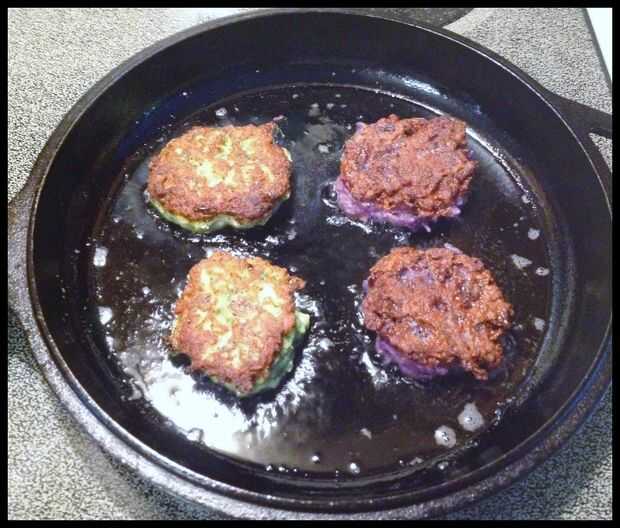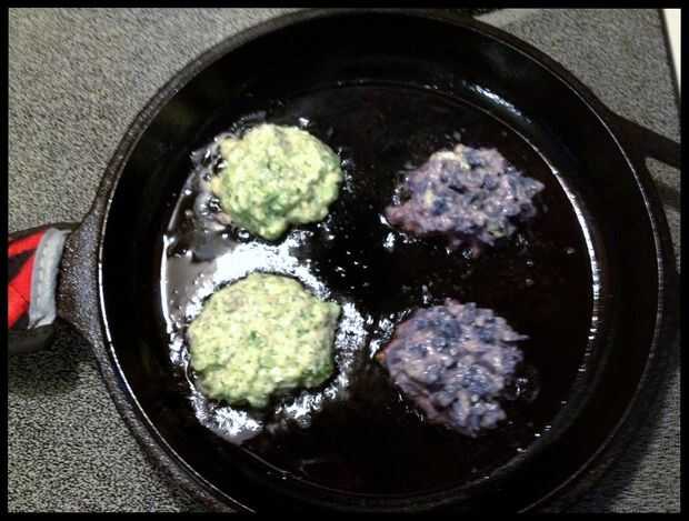 Cuando aceite comienza a ripple, cucharada (yo usé un pequeño helado scooper) 2 cucharadas tamaño de montón de pasta en la sartén y luego aplanarlos un poco con la cuchara o espátula. Repita con la masa adicional, dejando un par de pulgadas entre cada buñuelo. (En mi sartén de 10 pulgadas cociné 4 buñuelos a la vez.)