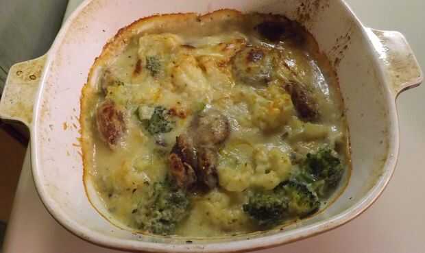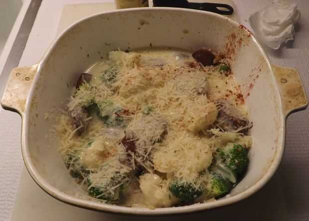 BRÓCOLI y coliflor en salsa de queso con salchichas AHUMADAS al horno (3 / 5 paso)