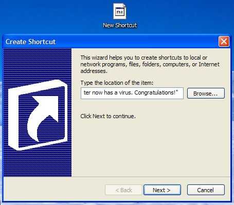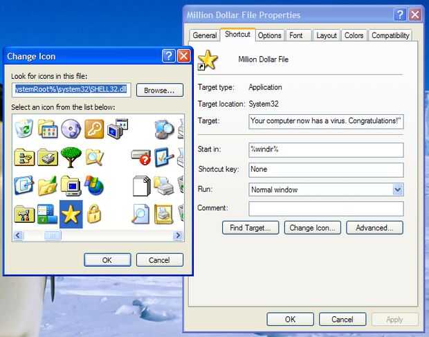Después de eso, haga clic en "Siguiente" y luego escriba algo que atraer el ojo de alguien como "Millones de dólares de archivo" y haga clic en "Finalizar". Ahora haga clic derecho sobre el nuevo acceso directo y seleccione "Propiedades". Haga clic en "Cambiar icono", haga clic en "Aceptar" Si aparece un cuadro de mensaje y seleccione un icono que atraer a del alguien ojo y haga clic en "Aceptar". La trampa está listo! Sólo esperar a que alguien haga clic en él!