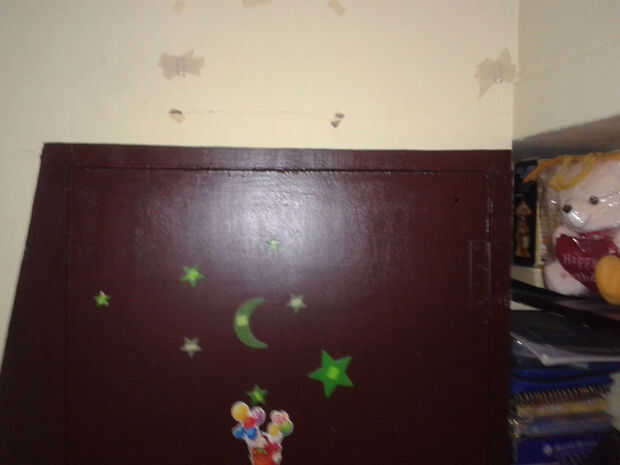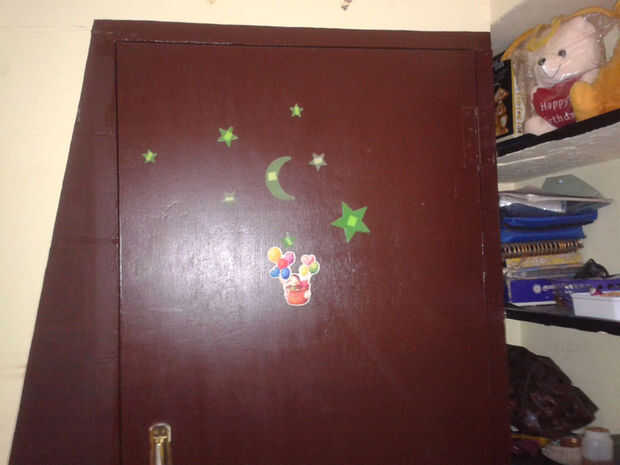 1) esta es mi habitación puerta. Fije el clip de salto en la pared sobre la puerta con cinta de papel. Arreglarlo casi medio pies de la puerta. Entonces sólo el artículo de broma nunca pegado en la puerta de cierre.