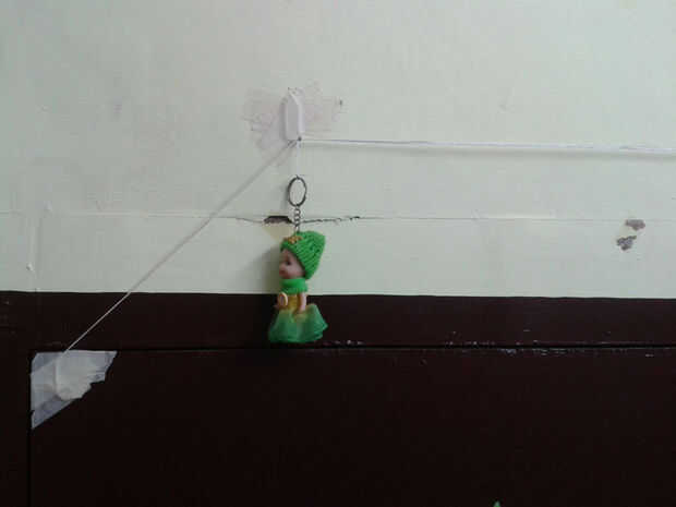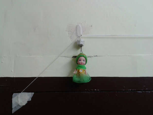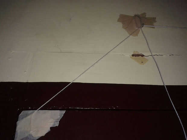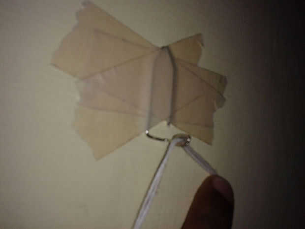 6) tomar otro hilo y atar la araña muñeco o goma o serpiente o lagarto o cualquier otro artículo en el hilo un espacio encima de la puerta (esto sólo evitar punto de pegado en el lado de la puerta)