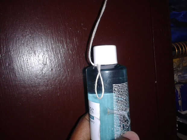 3) dejar la botella para colgar y sujetar el otro lado del hilo.