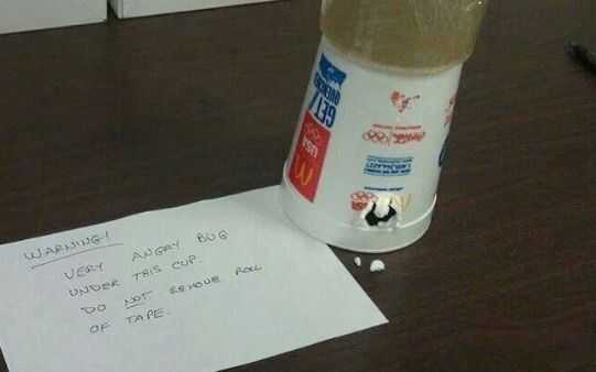 Esto también es opcional pero es divertido. Después se dan cuenta el tp se ha ido (si tienes rollos de repuesto en el baño, mueva los) luego tomar una taza de plástico o de espuma de poliestireno y apuñalar a un agujero con un lápiz. Poner algo pesado encima y escribir una nota