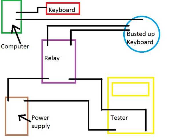 Conectar los cables que salen del teclado en el control de la transmisión, y luego conecte el probador del circuito y la fuente de alimentación. Ahora, Conecte ambos los teclados en la computadora (el roto para arriba y los regulares). En el regular, pulse la tecla Bloq Num y debe tomar una lectura de su medidor.